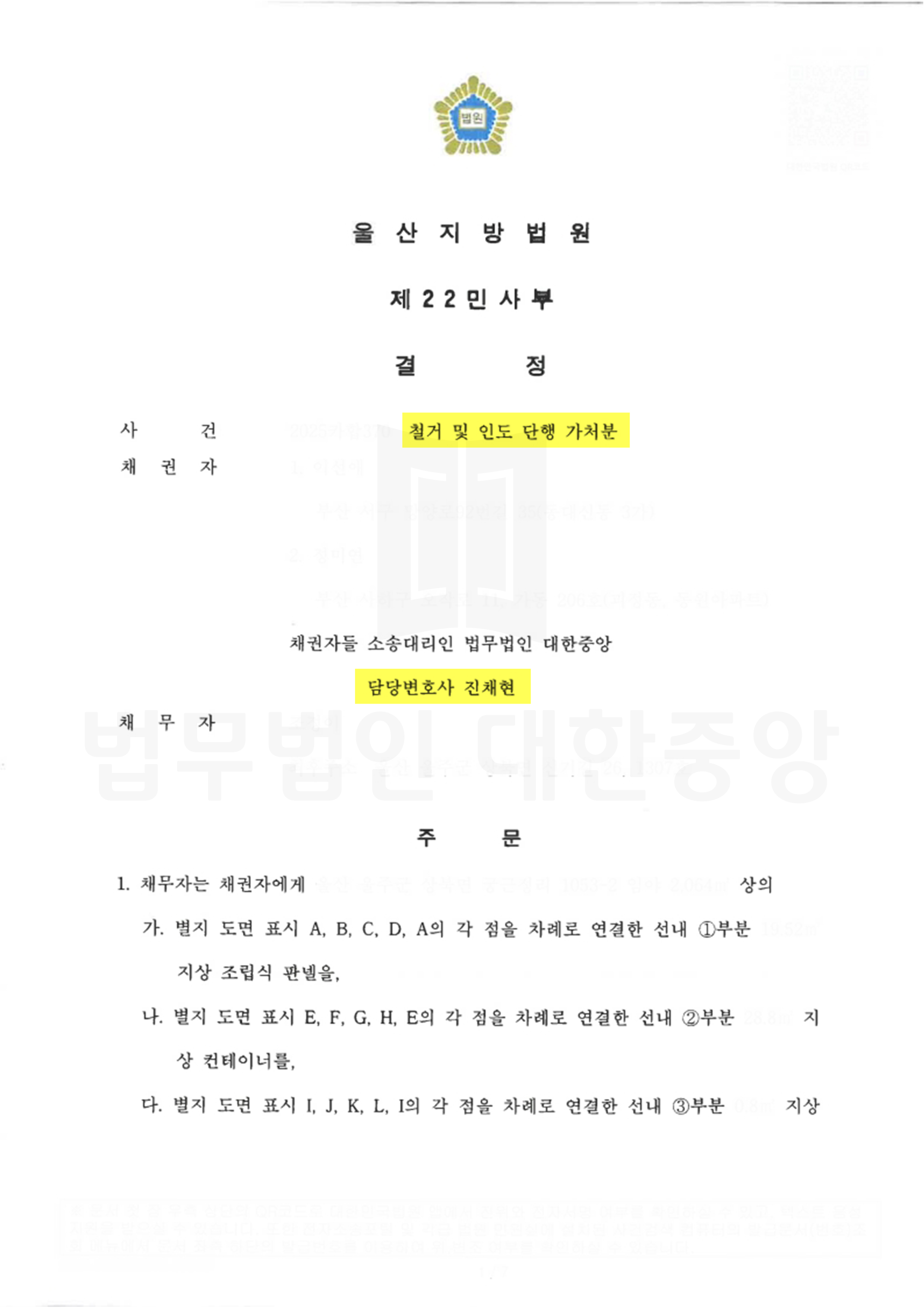 채권자 전부 인용 인도단행가처분의 빠른 인용과, 결정 후 집행관사무실과의 협업을 통하여 일주일 이내 불법건축물을 모두 철거하고, 집행비용확정 신청을 통하여 집행에 소요된 천만원이 넘는 금액을 전부 확정 받음.Jin Chae Hyun 진채현 변호사