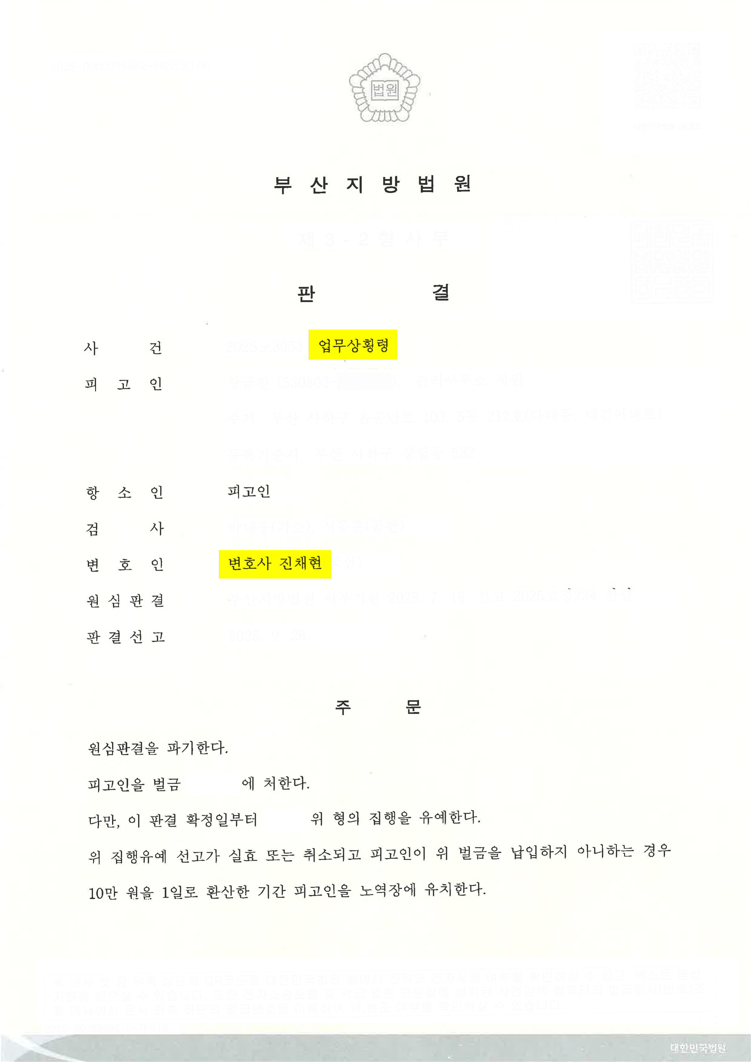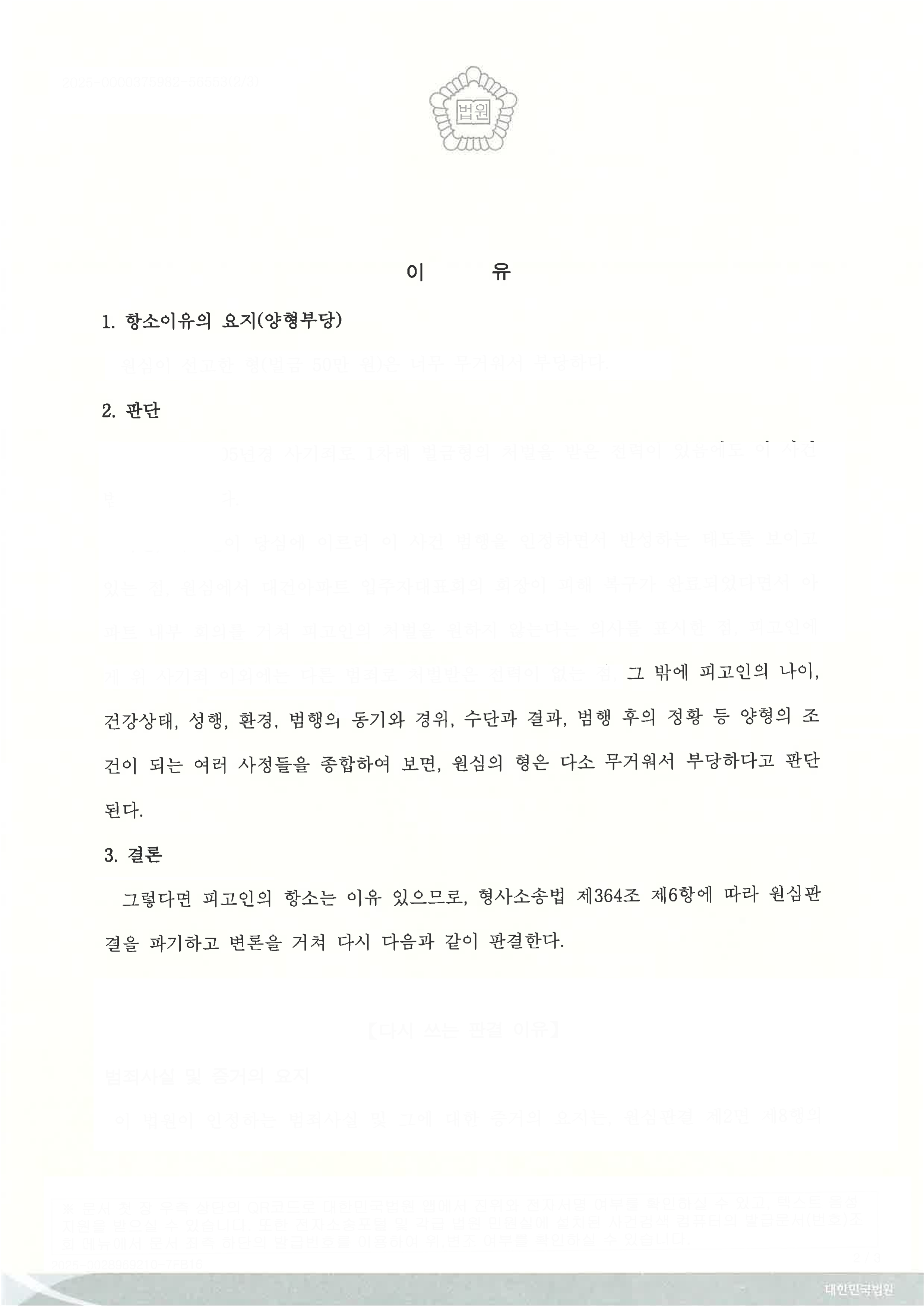 벌금이 선고된 1심을 파기하고, 벌금형에 대한 집행유예 판결