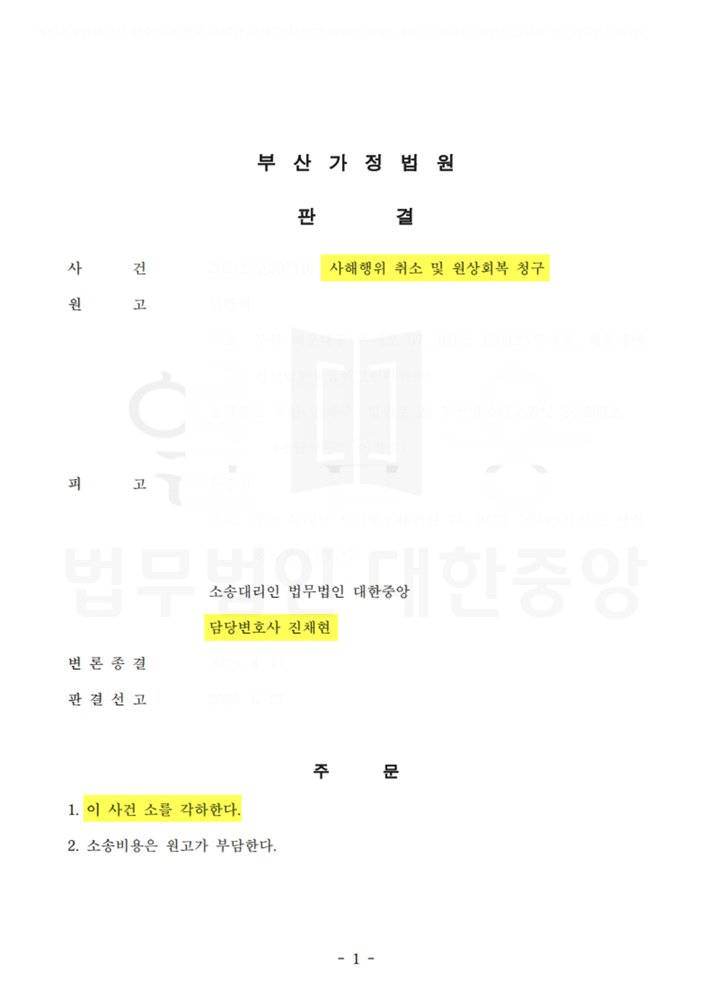 소외 사건의 이혼소송 중 친인척 명의로 등기된 부동산에 대하여 사해행위 취소 및 원상회복 청구의 소송이 제기됨