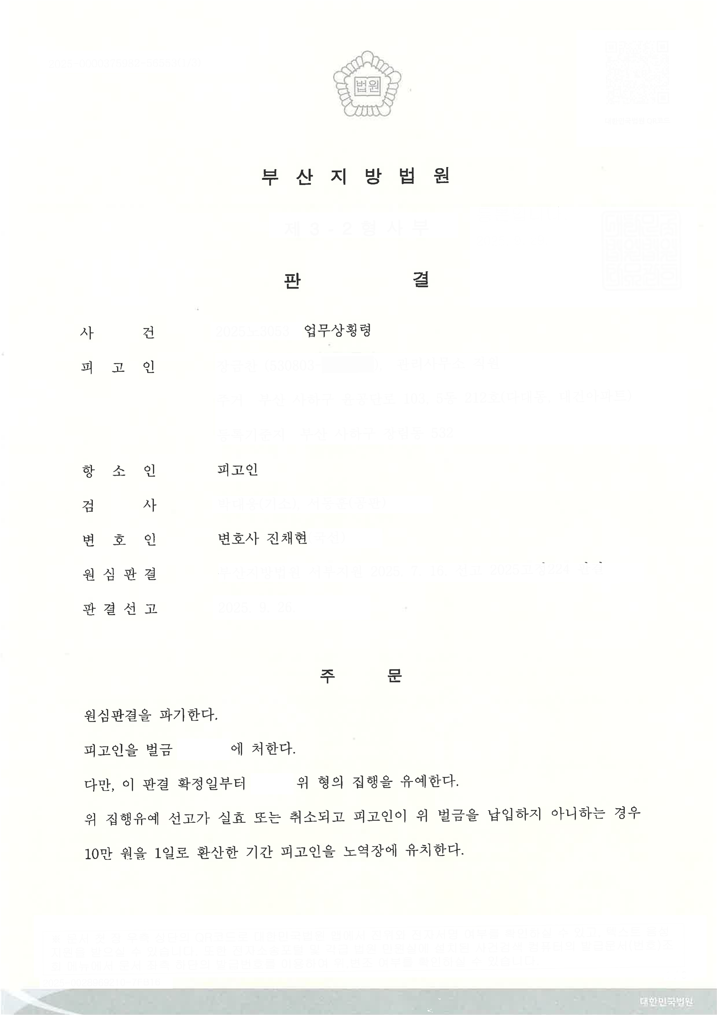 벌금이 선고된 1심을 파기하고, 벌금형에 대한 집행유예 판결