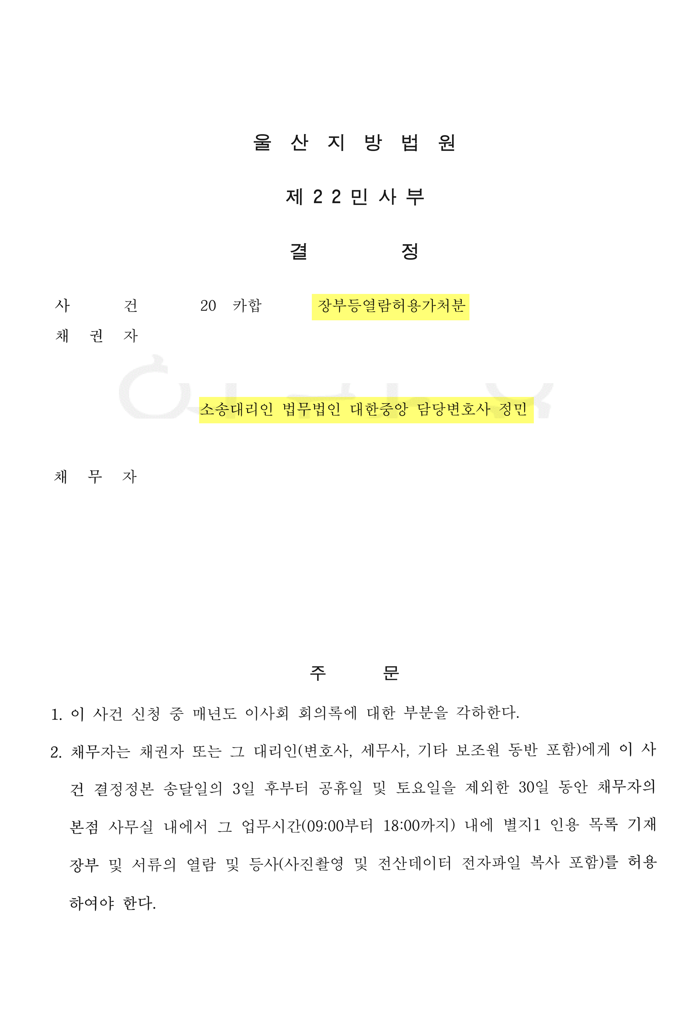 수주주인 채권자가 제기한 회계 장부 및 서류 열람·등사 청구가 상법상 허용 범위 내의 정당한 권리 행사인지, 그리고 가처분이라는 임시적 절차를 통해 어느 범위까지 열람·등사를 허용하는 것이 타당한지 여부에있습니다.사건 결과